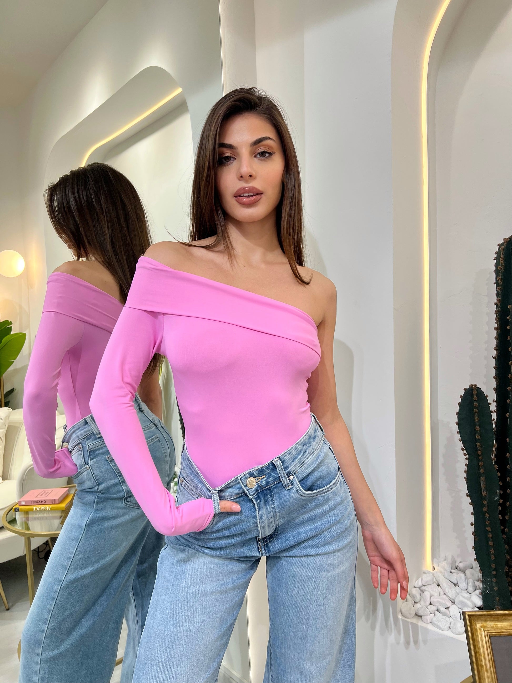 Body effetto lycra dal taglio monospalla, con vestibilità aderente che esalta la figura. La chiusura con gancetti nel cavallo aggiunge praticità e comfort, rendendolo perfetto per un look sofisticato e sensuale.