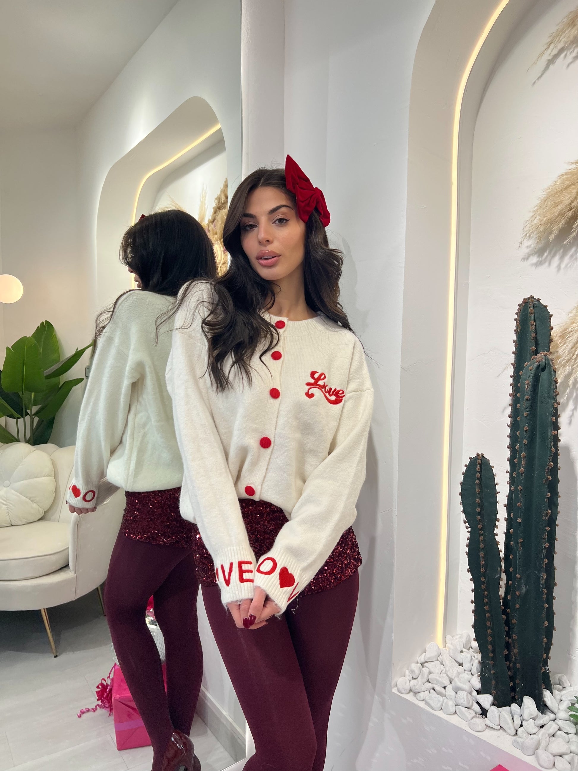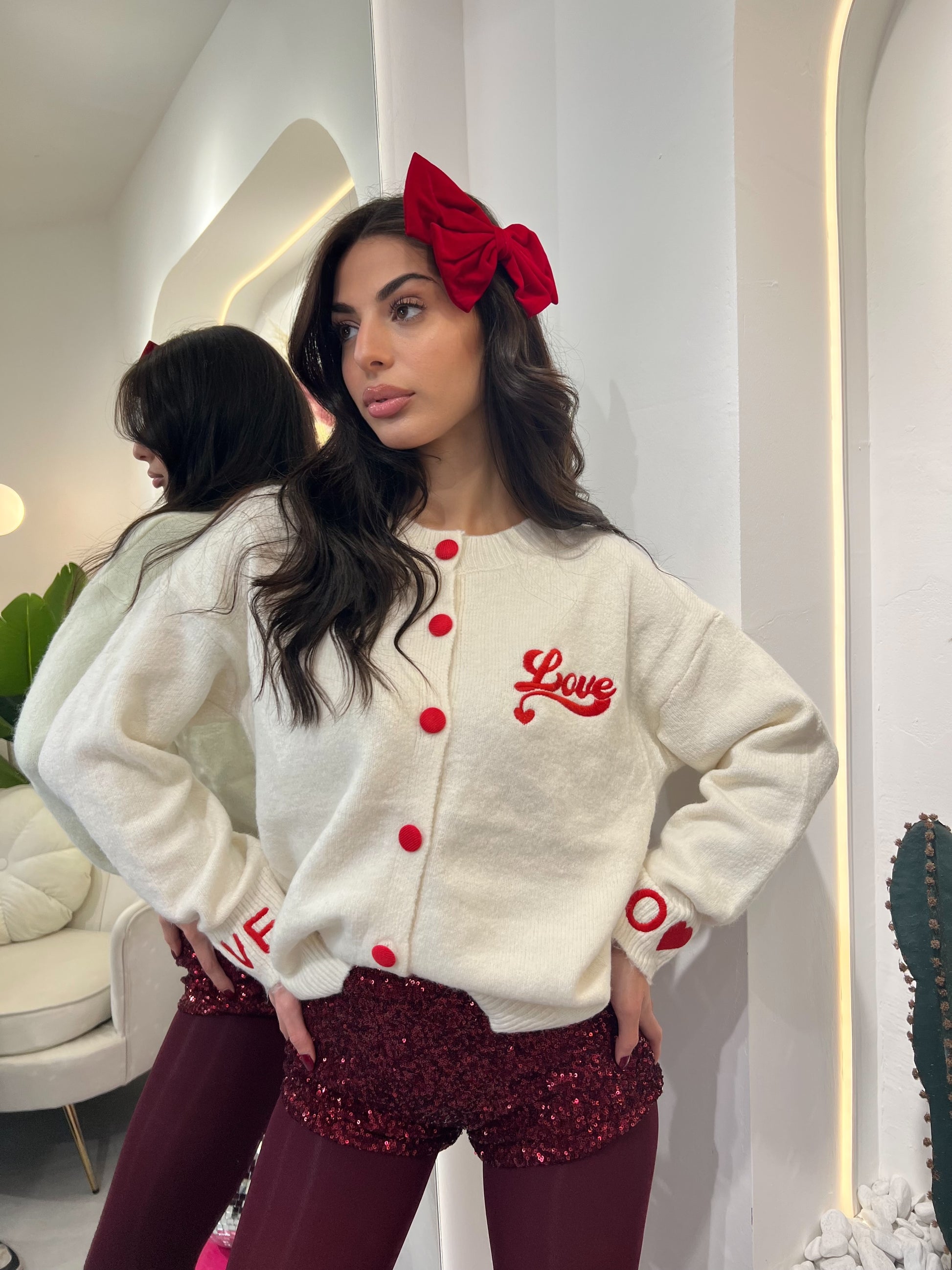Cardigan in maglia morbida con bottoni frontali a contrasto. Presenta ricamo “Love” sul petto e dettagli ricamati su entrambe le maniche. Linea leggermente morbida e lunghezza regolare.
