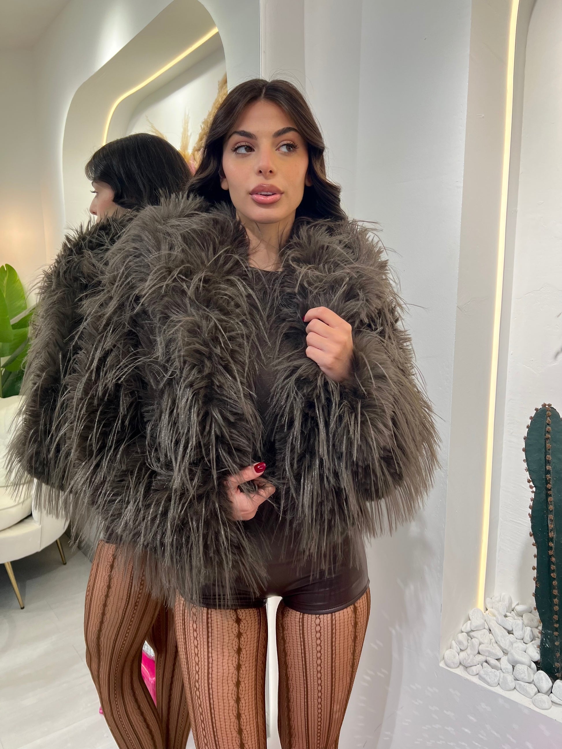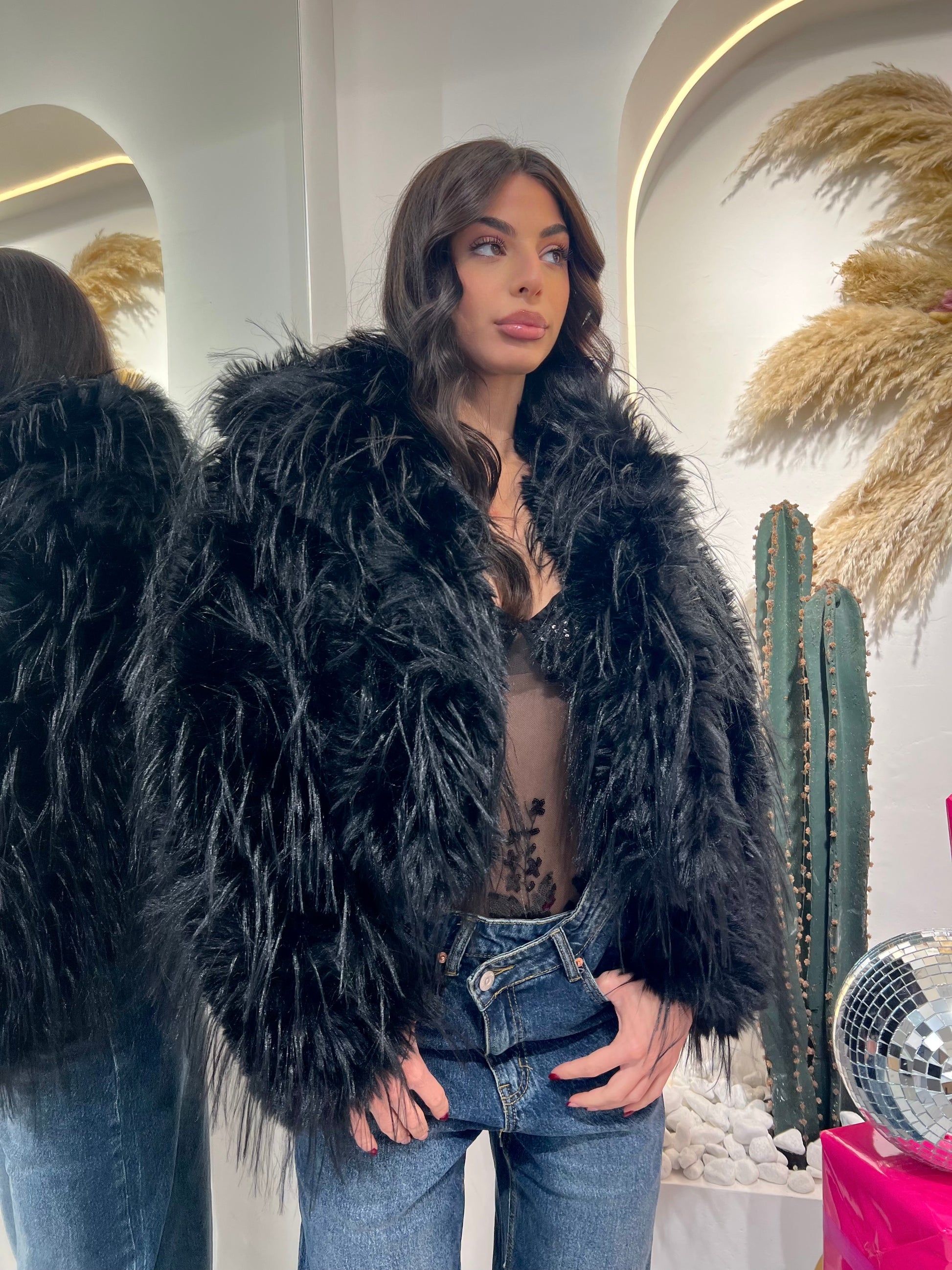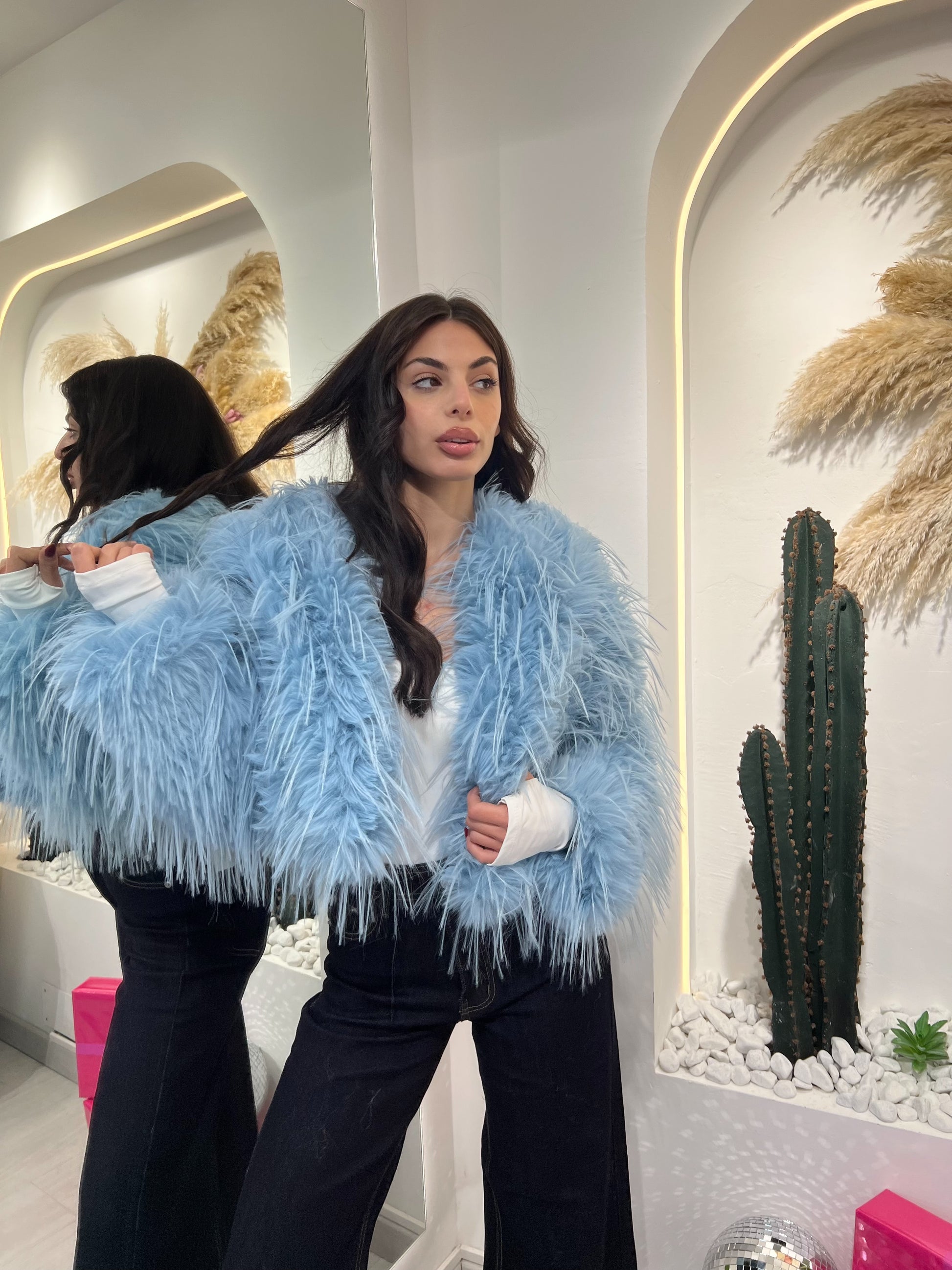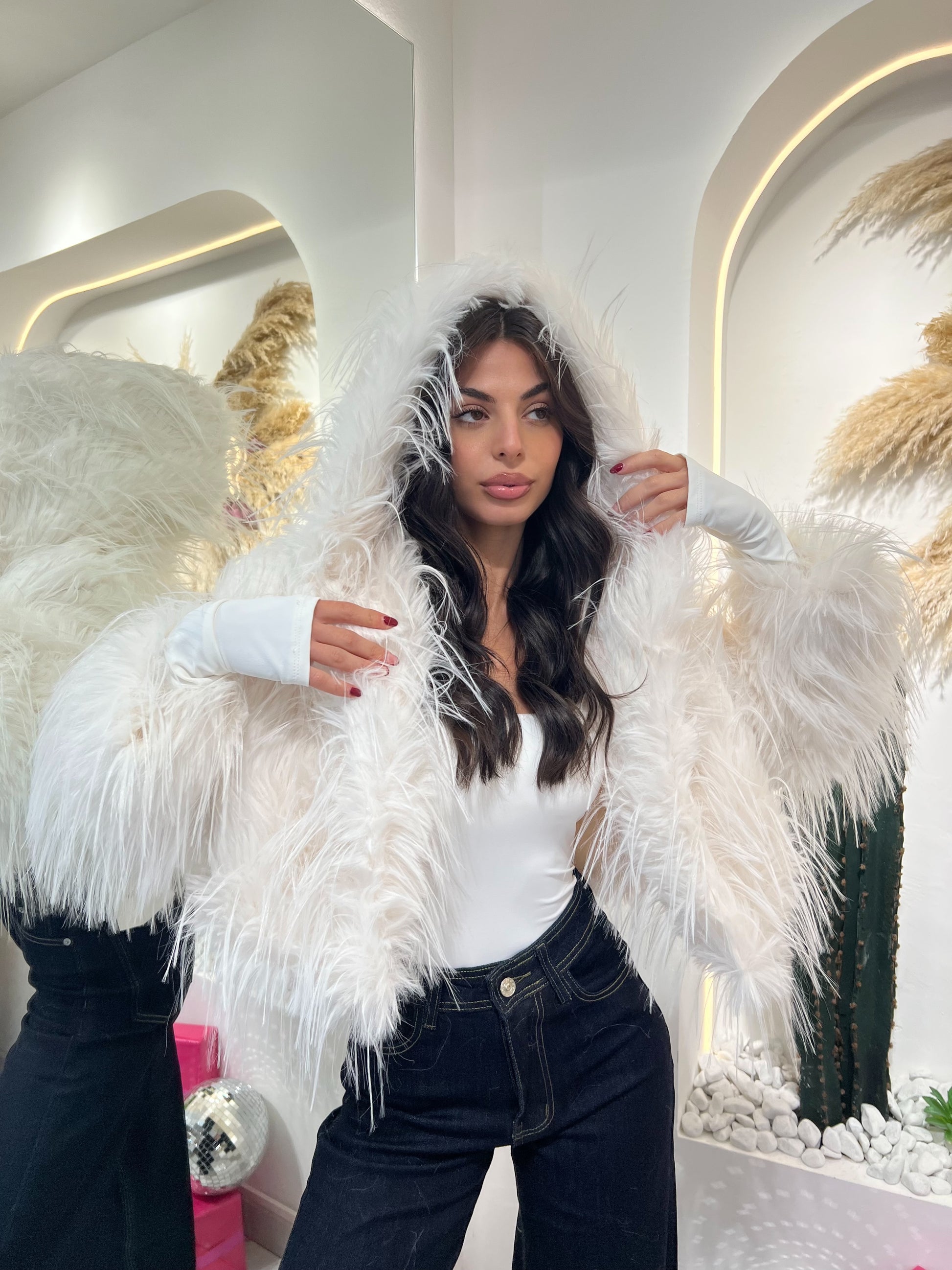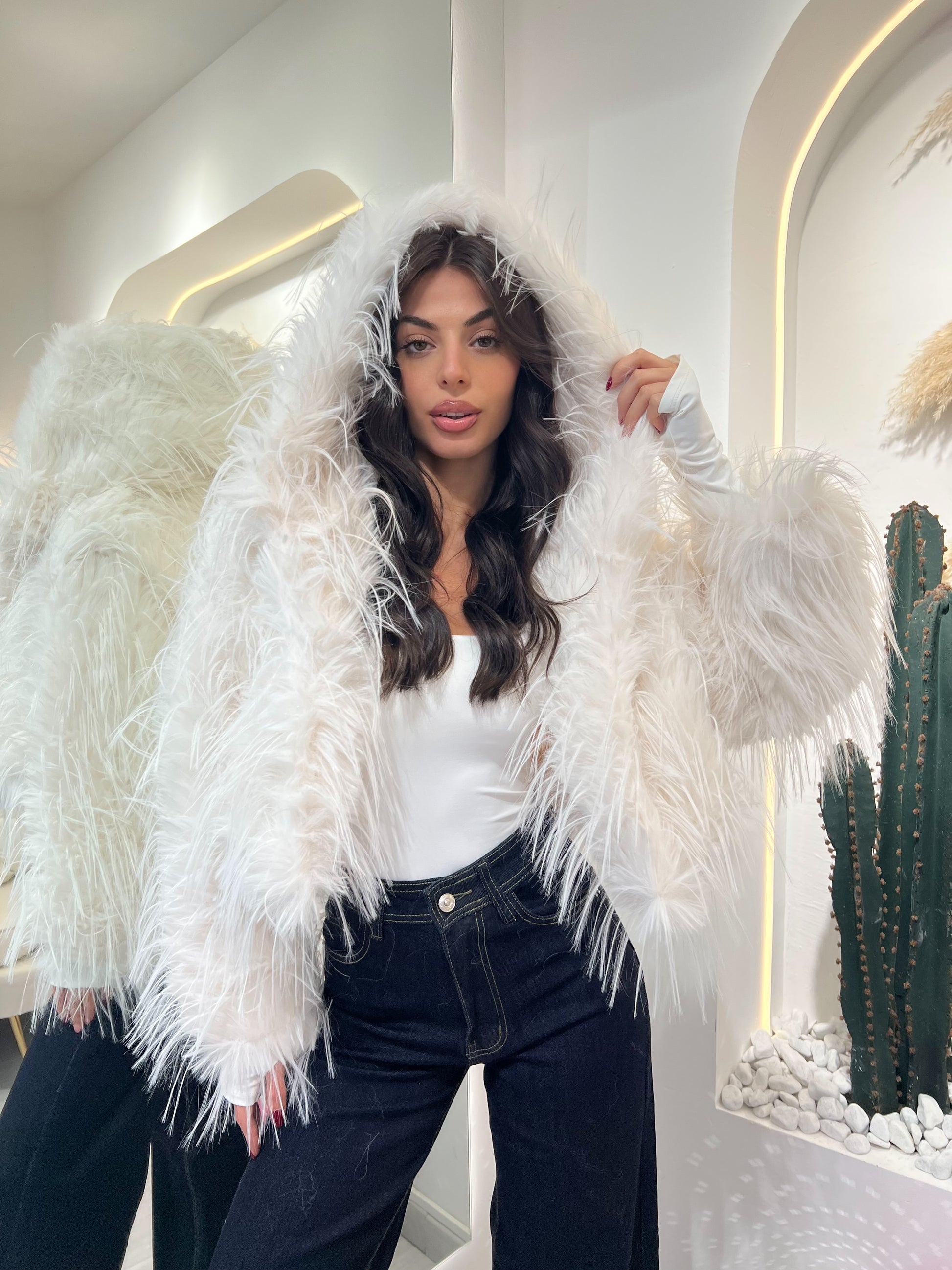 Ecopelliccia corta con cappuccio, caratterizzata da un effetto piumato voluminoso e morbido al tatto. Le maniche ampie e la linea leggermente oversize donano un look avvolgente e scenografico. Chiusura frontale invisibile per un finish pulito.