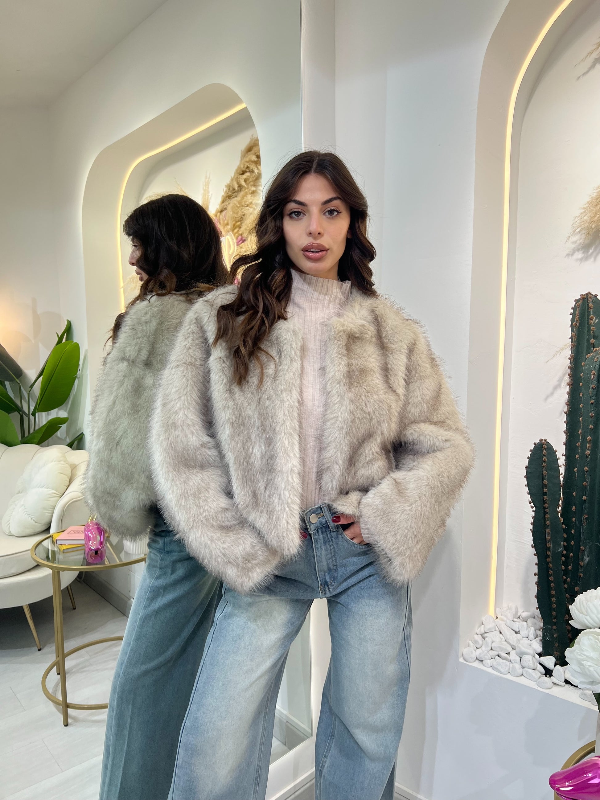 Giaccone in ecopelliccia dal taglio corto e fit morbido, realizzato in pelliccia sintetica di alta qualità dall’effetto soffice e luminoso. Presenta chiusura frontale con ganci nascosti e maniche ampie per un comfort assoluto.
