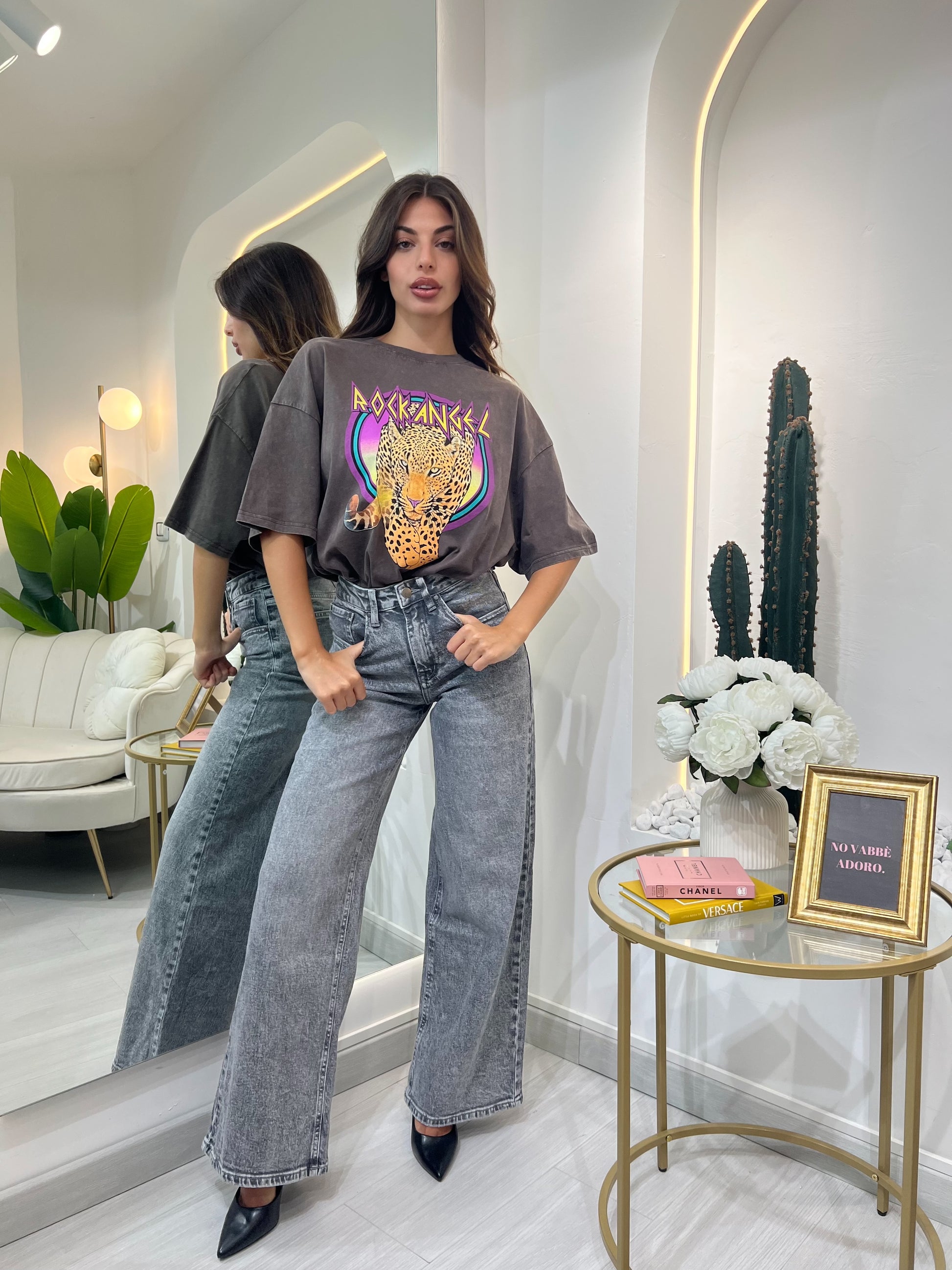 Jeans a vita alta con gamba ampia e linea dritta. Realizzati in denim cotone non elasticizzato con lavaggio effetto vissuto. Presentano chiusura con bottone e zip, passanti per cintura e cinque tasche classiche. Fondo leggermente svasato per una vestibilità confortevole e contemporanea.
