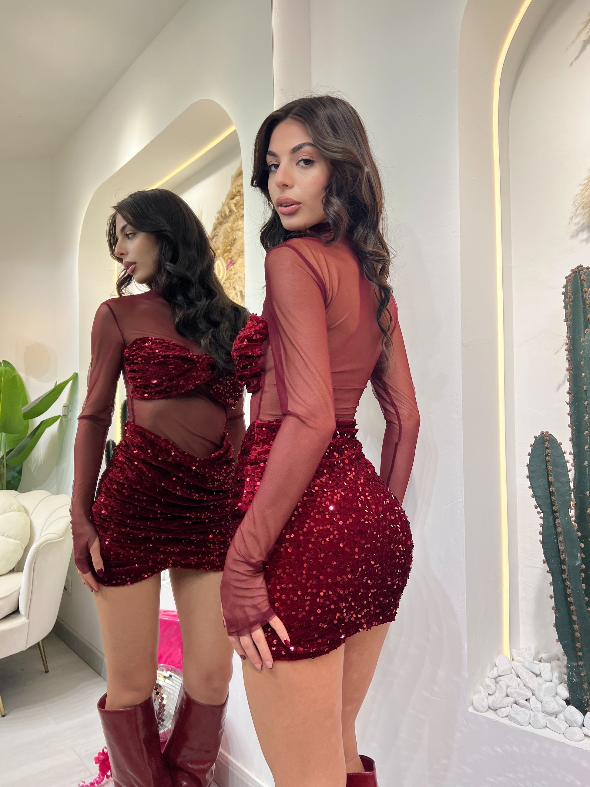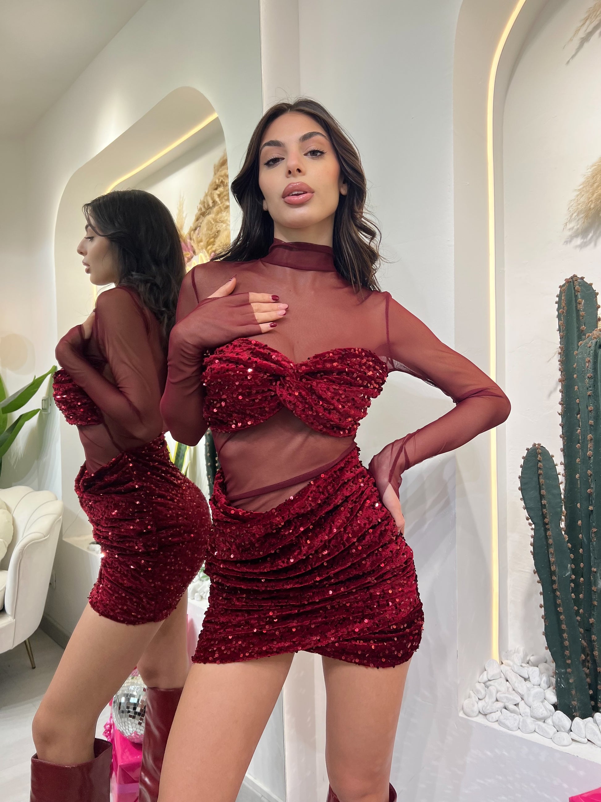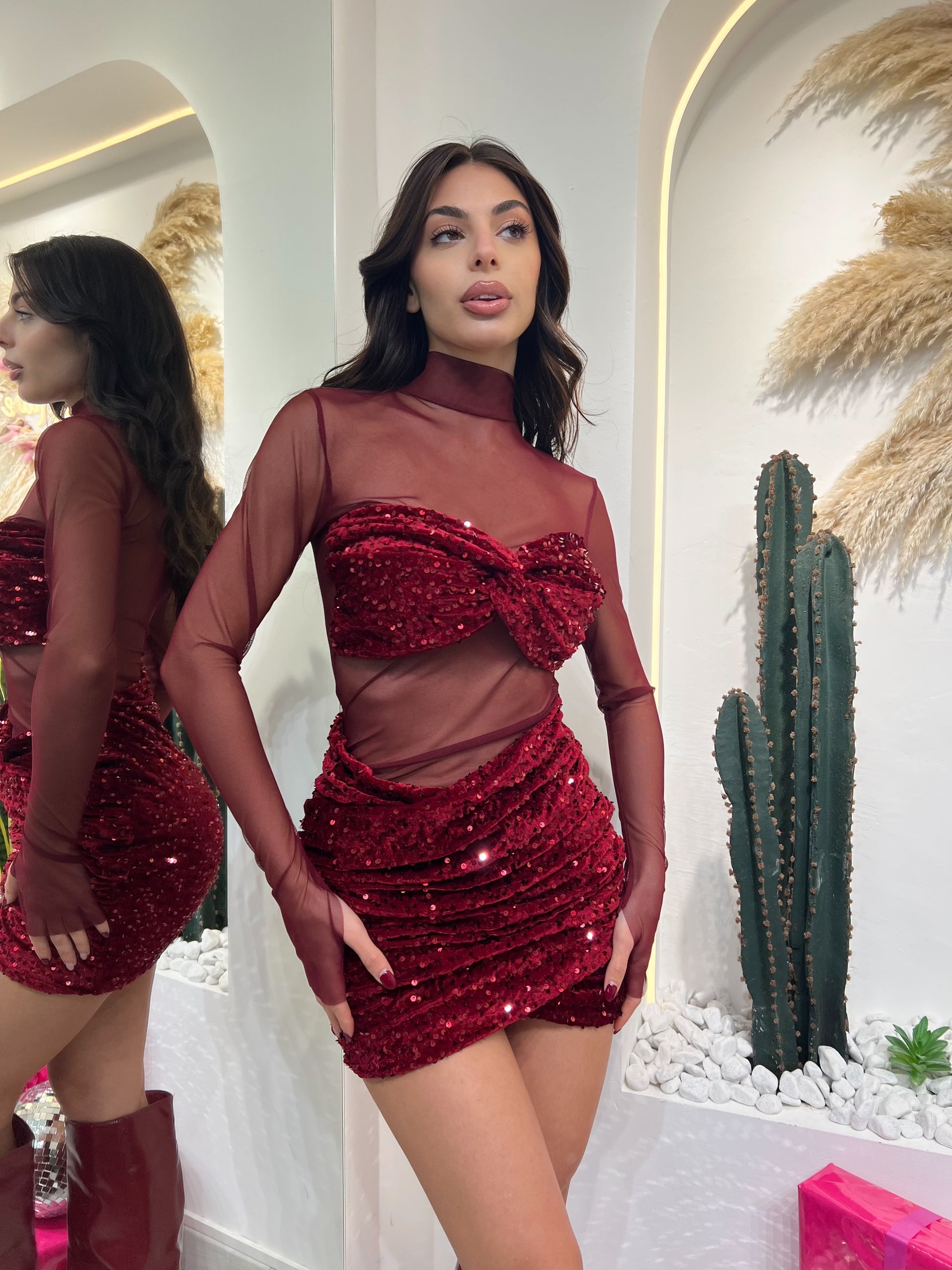 Abito corto con velatura in tulle trasparente e dettagli in paillettes. Il modello presenta maniche lunghe in tulle, drappeggi e vestibilità aderente che valorizza la silhouette.