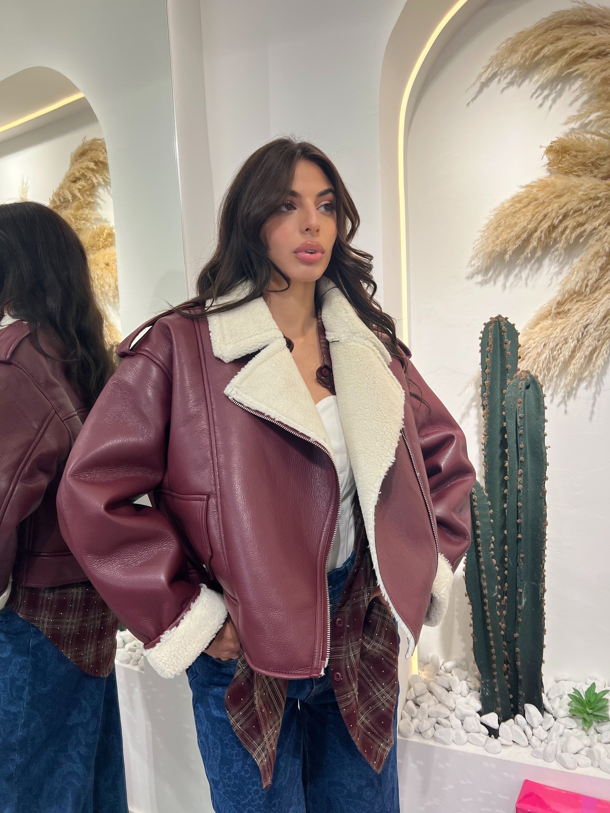 Montone effetto shearling con interno morbido e avvolgente. Modello dal taglio strutturato, colletto ampio e polsini risvoltati. Chiusura con zip centrale e dettaglio cinturini decorativi.