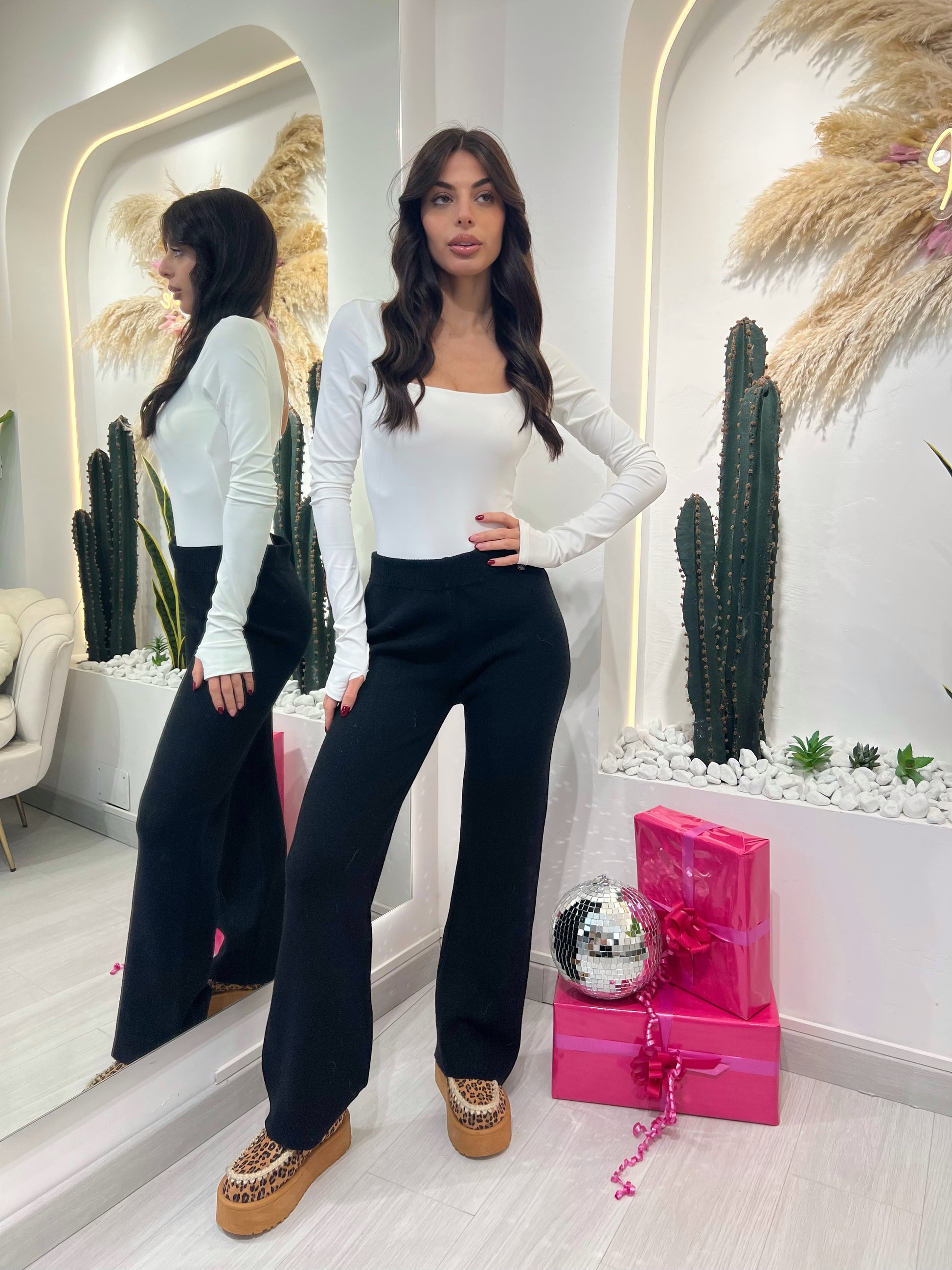 Pantalone morbido a gamba larga, realizzato in un tessuto confortevole e leggermente elasticizzato. La vita alta con fascia morbida valorizza la silhouette e garantisce una vestibilità impeccabile.