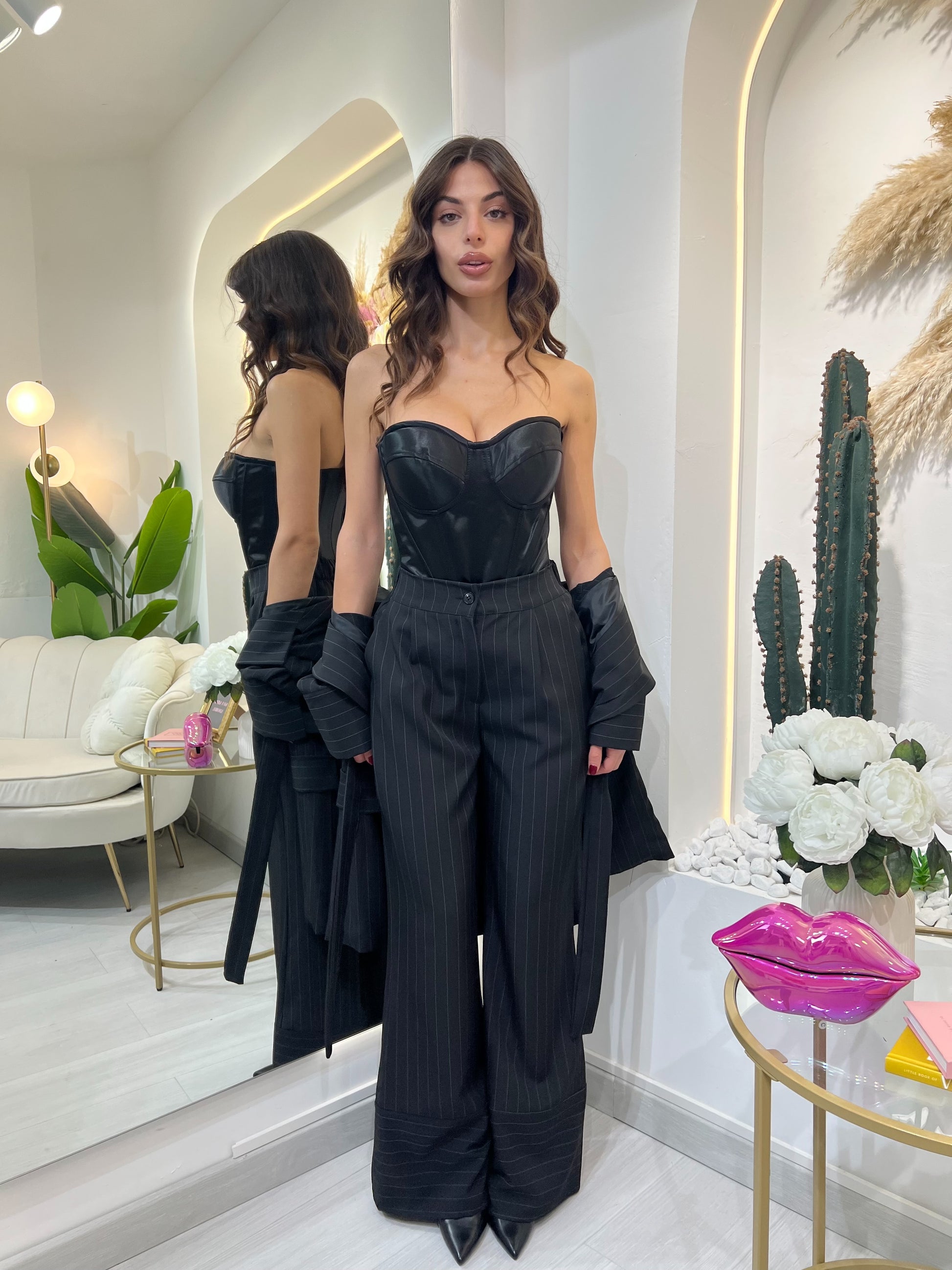 Tailleur gessato dal taglio elegante e contemporaneo, composto da blazer monopetto con cintura coordinata e pantalone ampio a vita alta. La giacca, con revers classico e chiusura a bottone, presenta una linea morbida che si adatta perfettamente alla figura, mentre il pantalone fluido con gamba larga slancia la silhouette donando movimento e carattere. Realizzato in un tessuto strutturato ma confortevole.