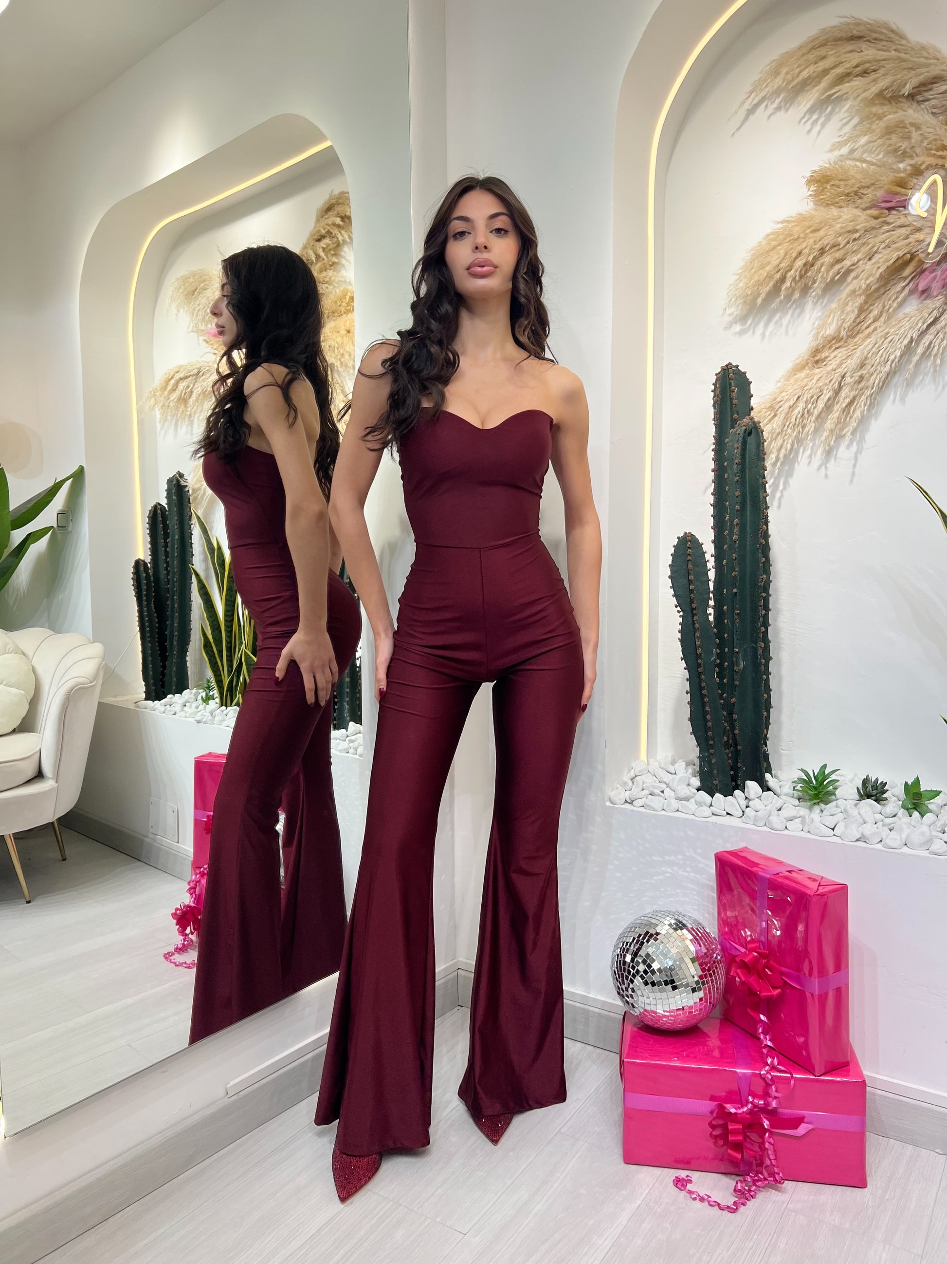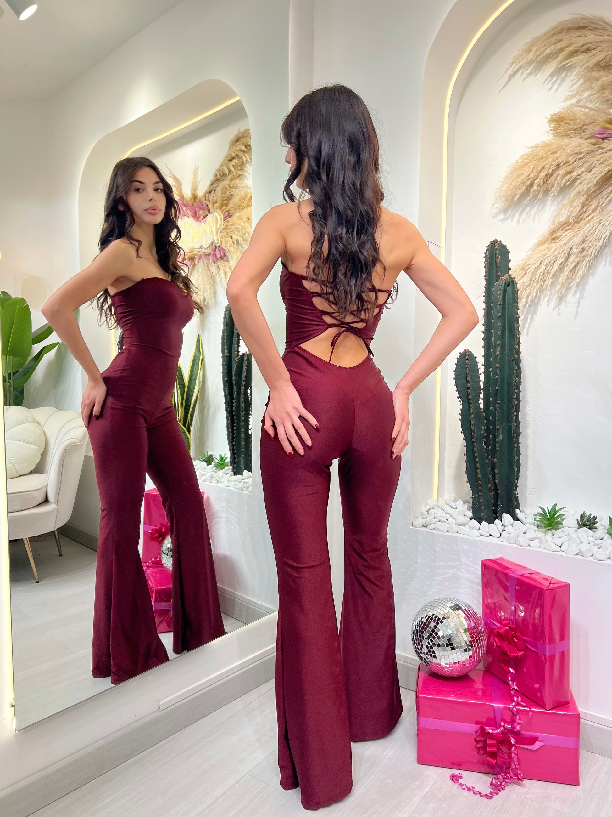 Tuta intera in lycra con scollo a cuore e vestibilità aderente che valorizza la silhouette. Presenta schiena scoperta con allacciatura a laccetti e gamba a palazzo, per un effetto slanciato ed elegante. Un capo femminile e raffinato, ideale per occasioni speciali e serate.