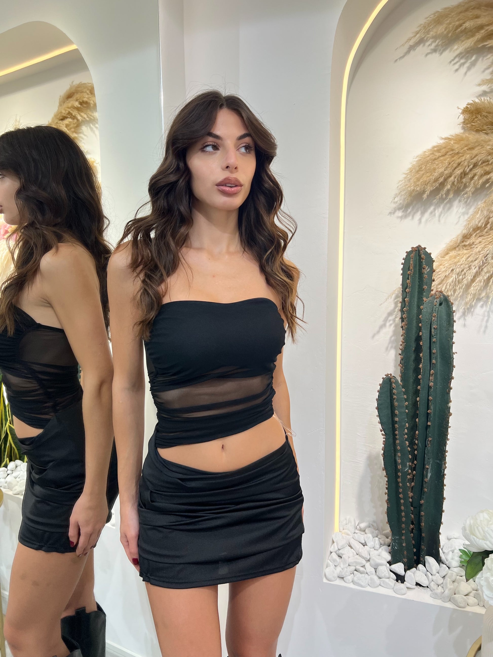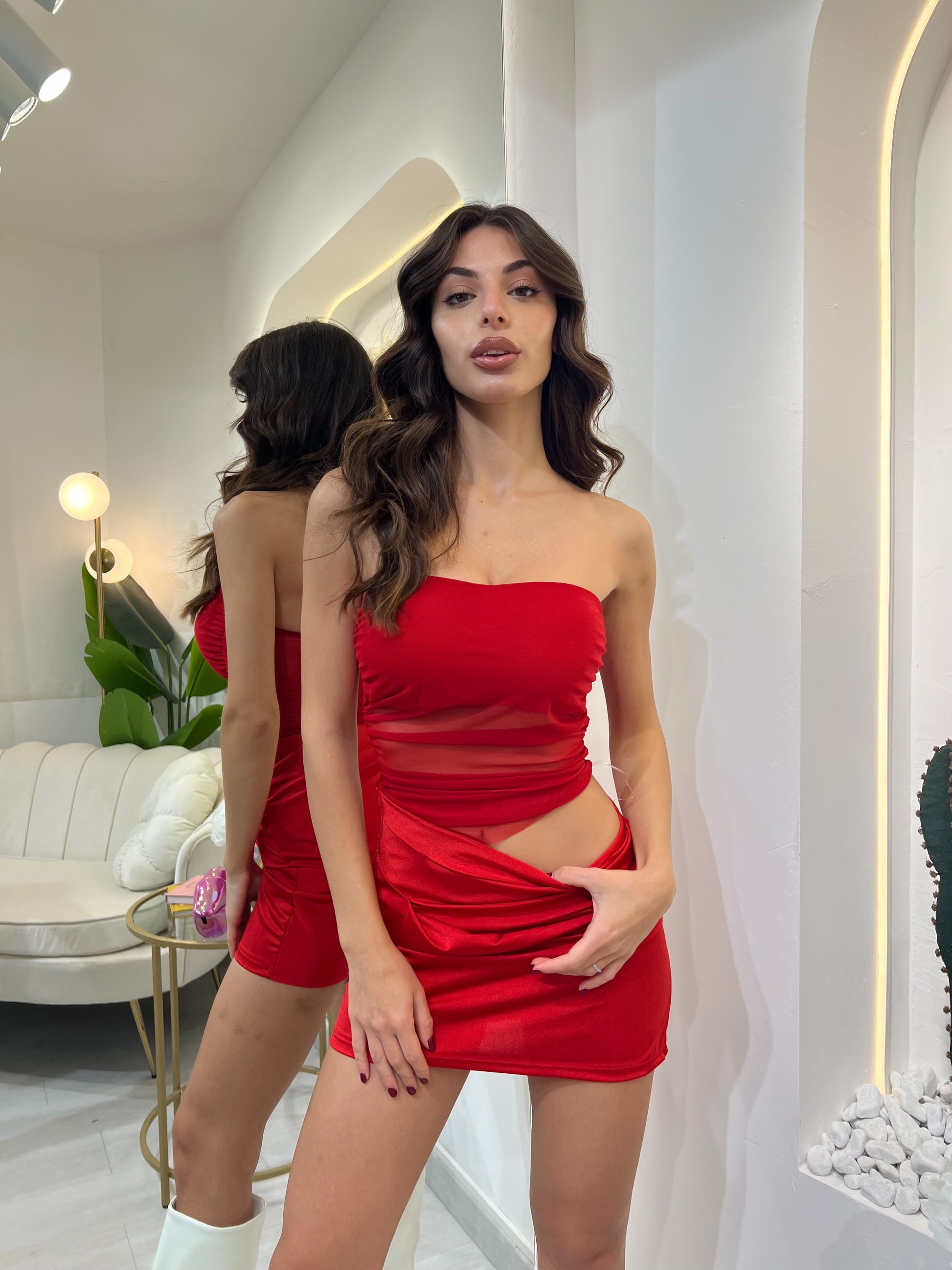 Abito corto dal design moderno e seducente, caratterizzato da corpino a fascia e dettaglio in tulle trasparente che avvolge il punto vita creando un elegante effetto cut-out. Realizzato in tessuto morbido ed elasticizzato, valorizza la silhouette con una vestibilità aderente e confortevole. Il drappeggio laterale della gonna aggiunge movimento e femminilità.